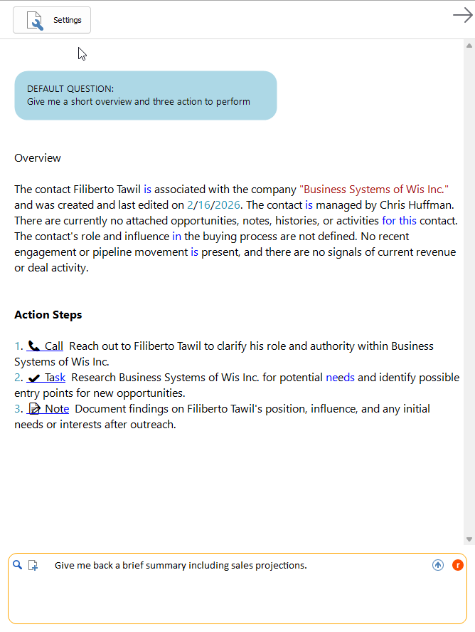 Research Mode turns your CRM data into instant intelligence. With a single click, it analyzes the current contact, company, activities, notes, and related records to generate clear summaries, relationship insights, and suggested next steps. Instead of digging through multiple tabs and history logs, users get a concise understanding of the relationship, engagement patterns, and opportunities—helping them respond faster, communicate more effectively, and make smarter decisions directly from within ACT!.